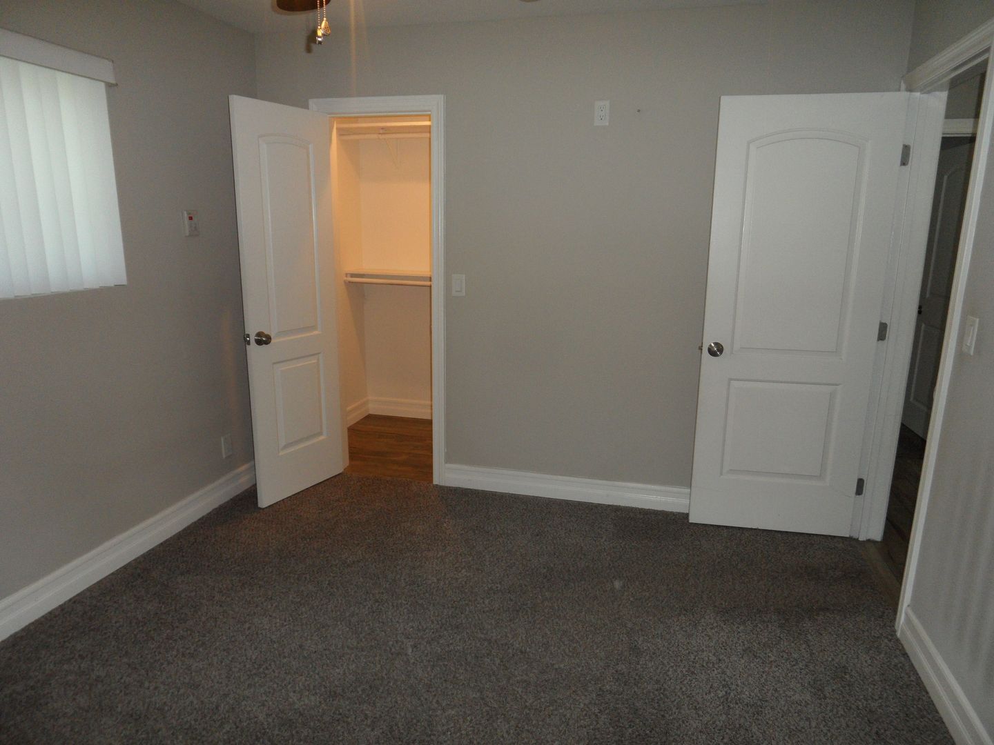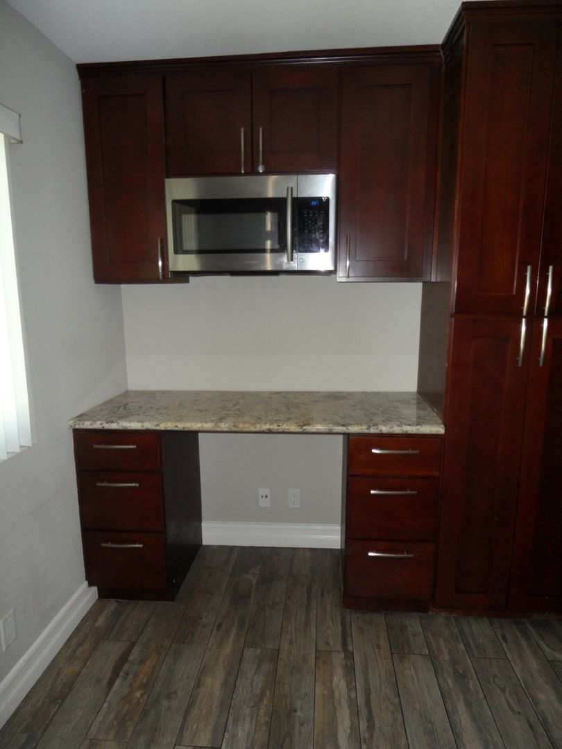 Updated, clean, 2 Bed 1 Bath "BACK" unit duplex with backyard with Citrus trees. 1-car garage with opener, and lots of additional parking in long driveway. Freshly painted with two toned paint, tile wood-plank floors and NEW carpet in bedrooms, kitchen features updated cabinets, granite counters, stainless steel appliances, built-in microwave oven, gas cooking, built-in desk, and ceiling fan. Both bedrooms have ceiling fans, and walk in closets. Bathroom has granite counters with beautiful tiled tub/shower. Stacked washer and dryer is included are located inside the unit. Water is included in rent.