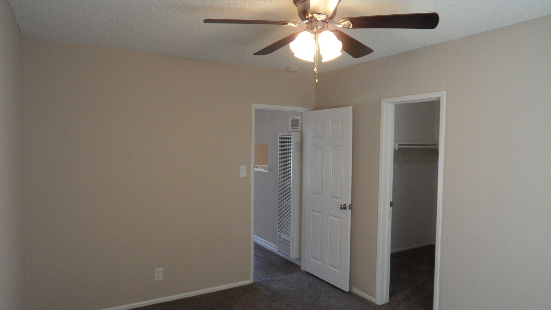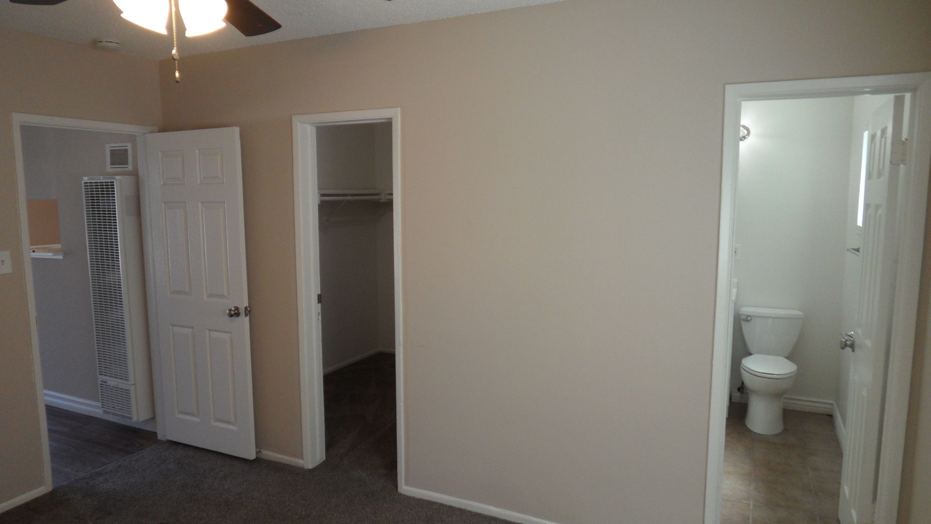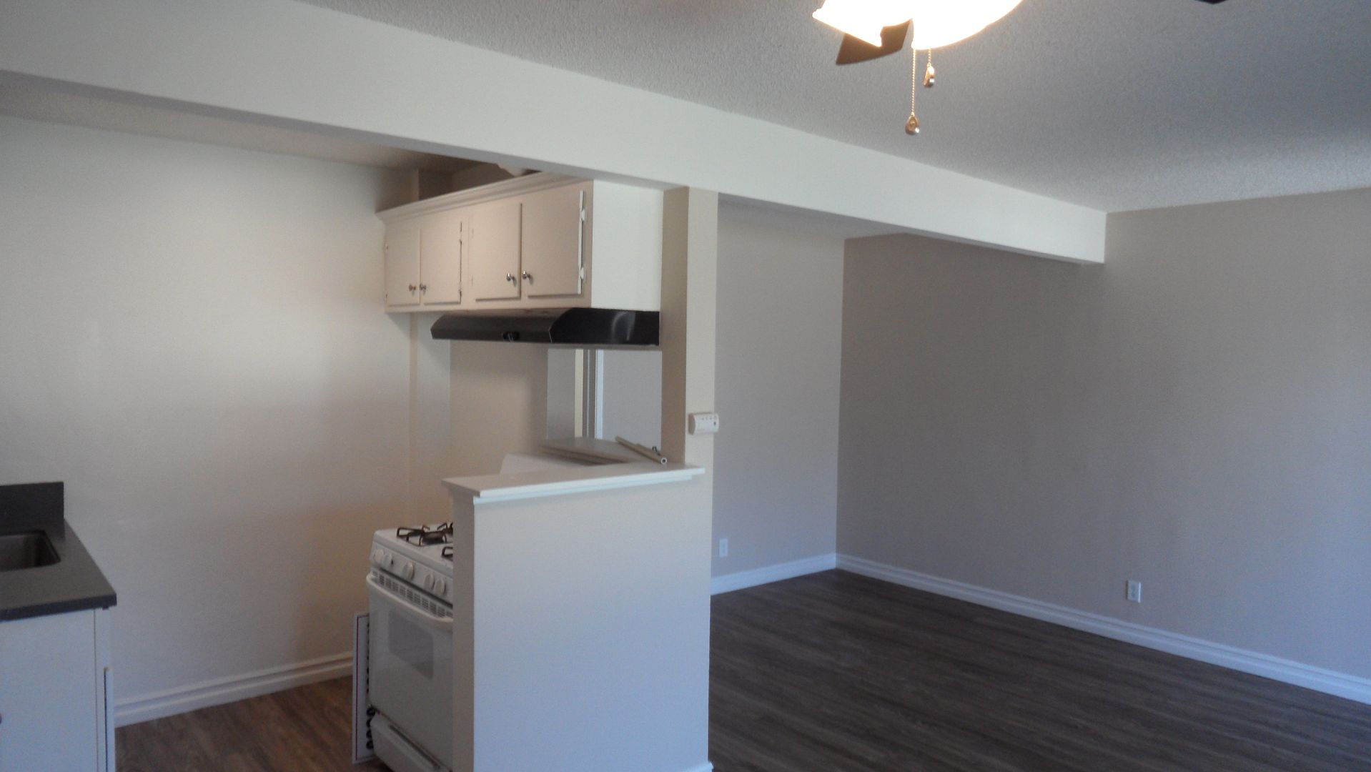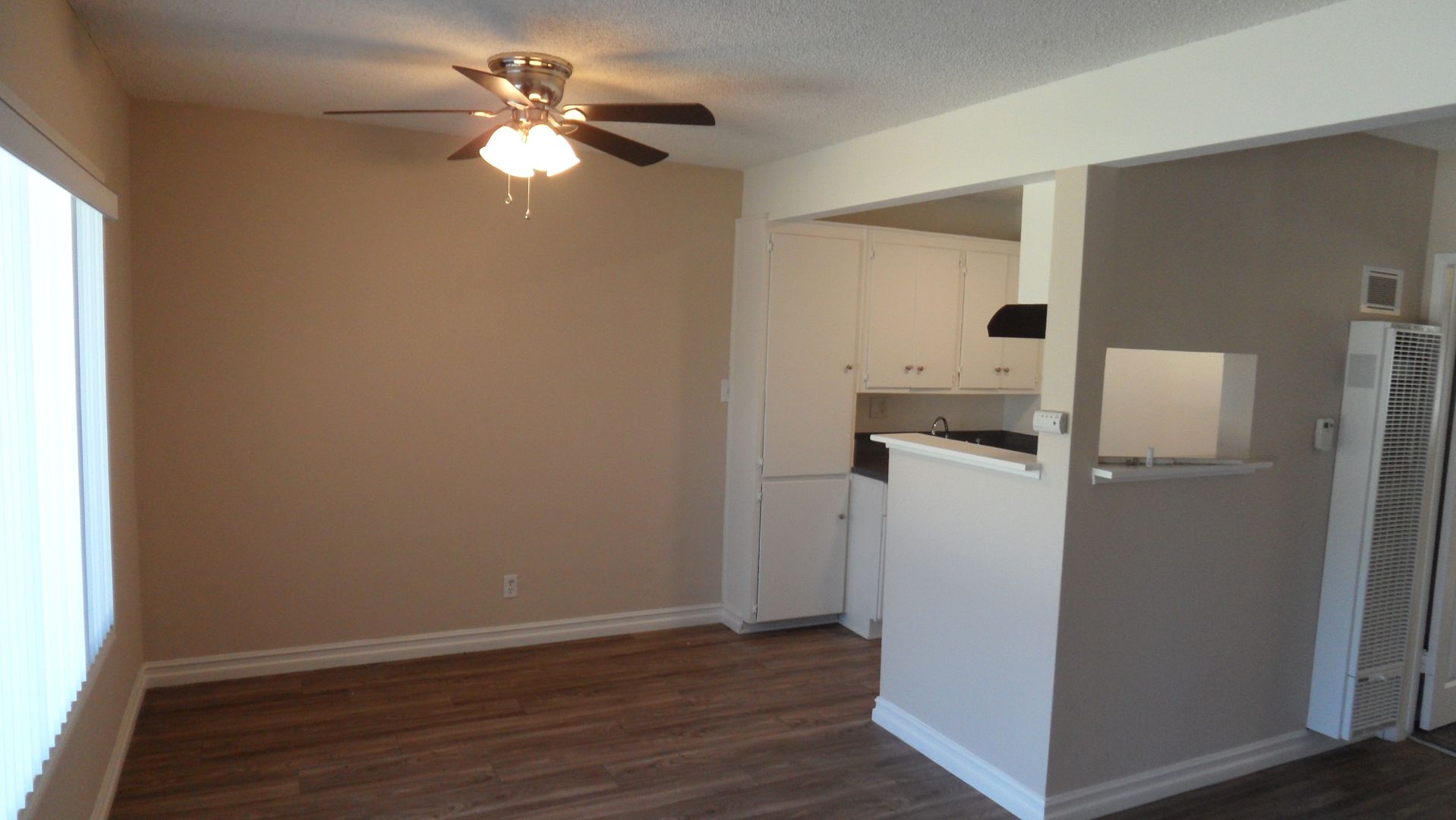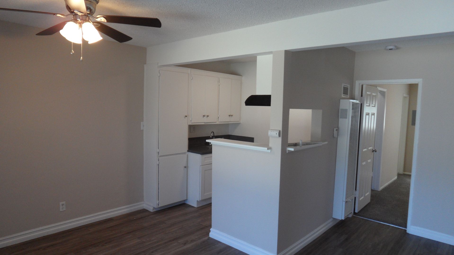 Ground level 1 bedroom 1 bath apartment with 1 car private garage and gated courtyard. Kitchen has gas cooking, eating area, and ceiling fan. Bedroom has carpet, walk-in closet, ceiling fan, and attached bathroom with brand new shower/tub combo. There is a laundry room on-site with coin operated washer and dryer. Water included in the rent.