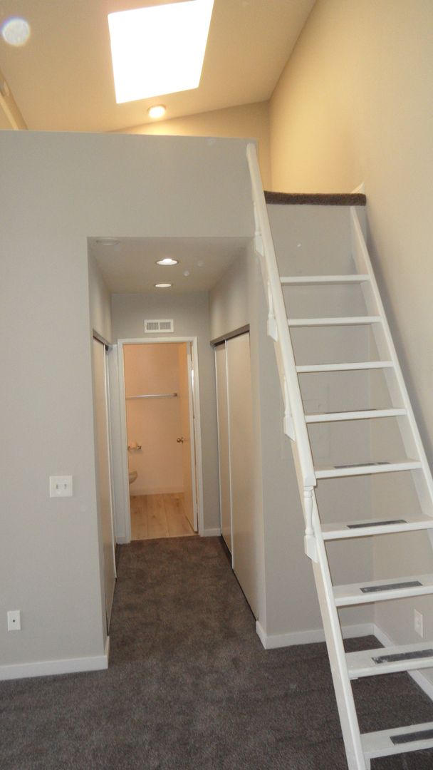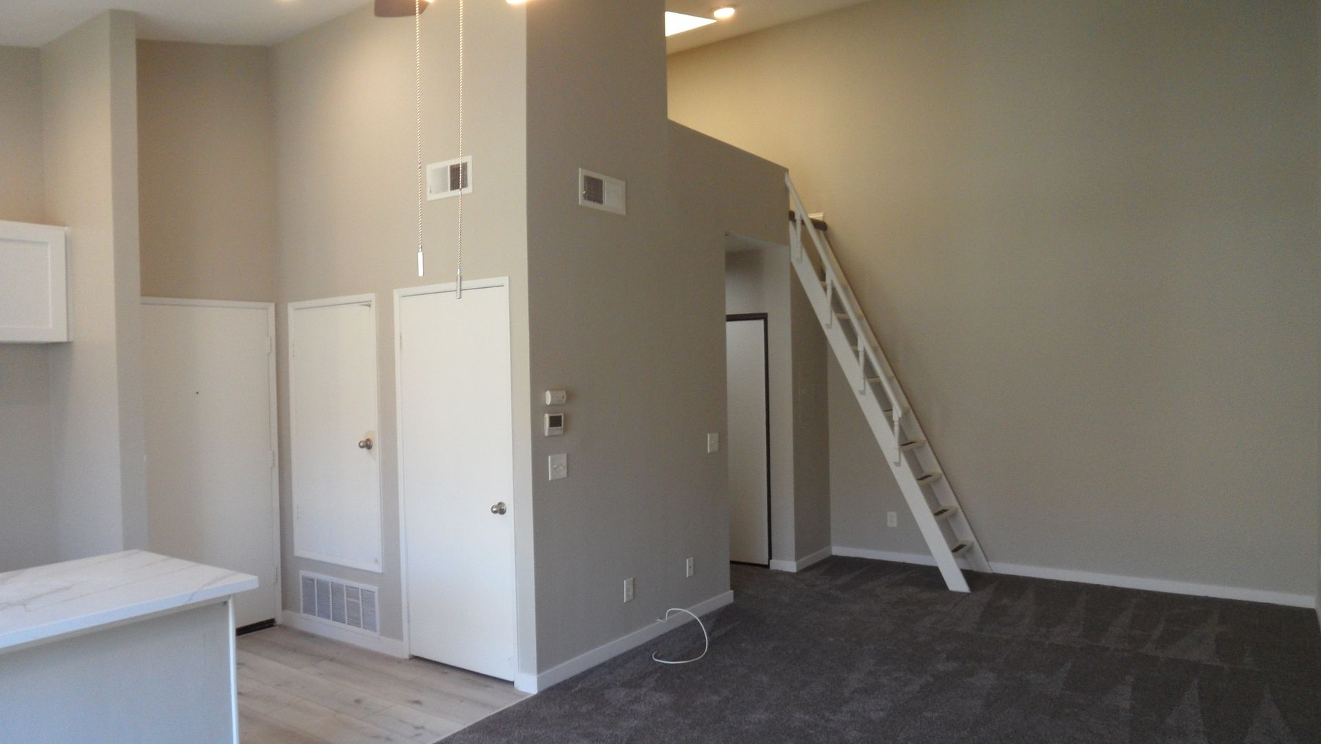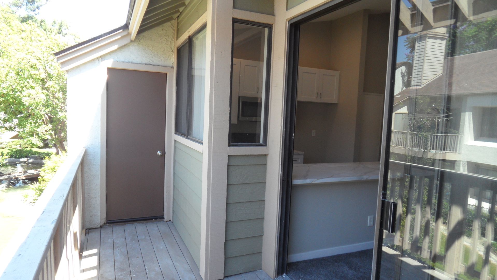 Remodeled upstairs Studio unit with sleeping loft, located on second level, in the desirable gated Lakeside community. Unit comes with 1 assigned carport. Unit features freshly painted two toned paint, new vinyl plank flooring, carpet and baseboards throughout, and central air conditioning. Remodeled kitchen with quartz countertops, breakfast bar, all new Shaker style soft-close cabinets and drawers, canned lighting, gas range, dishwasher, microwave. Large vaulted living area with ceiling fan and eating area just off the kitchen with oversized sliding glass door opens to balcony overlooking beautiful landscaping and creek. Balcony has storage closet. Upstairs loft with skylight and plenty of room for a queen-size mattress. Bathroom also has a brand new vanity and a shower/tub combo. Dual closets in dressing area. Stacked washer and dryer included and located inside the unit. Community boasts two pools and spas. Water and trash included in rent.