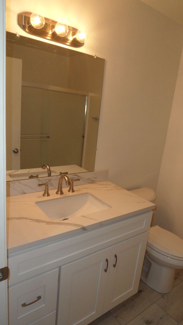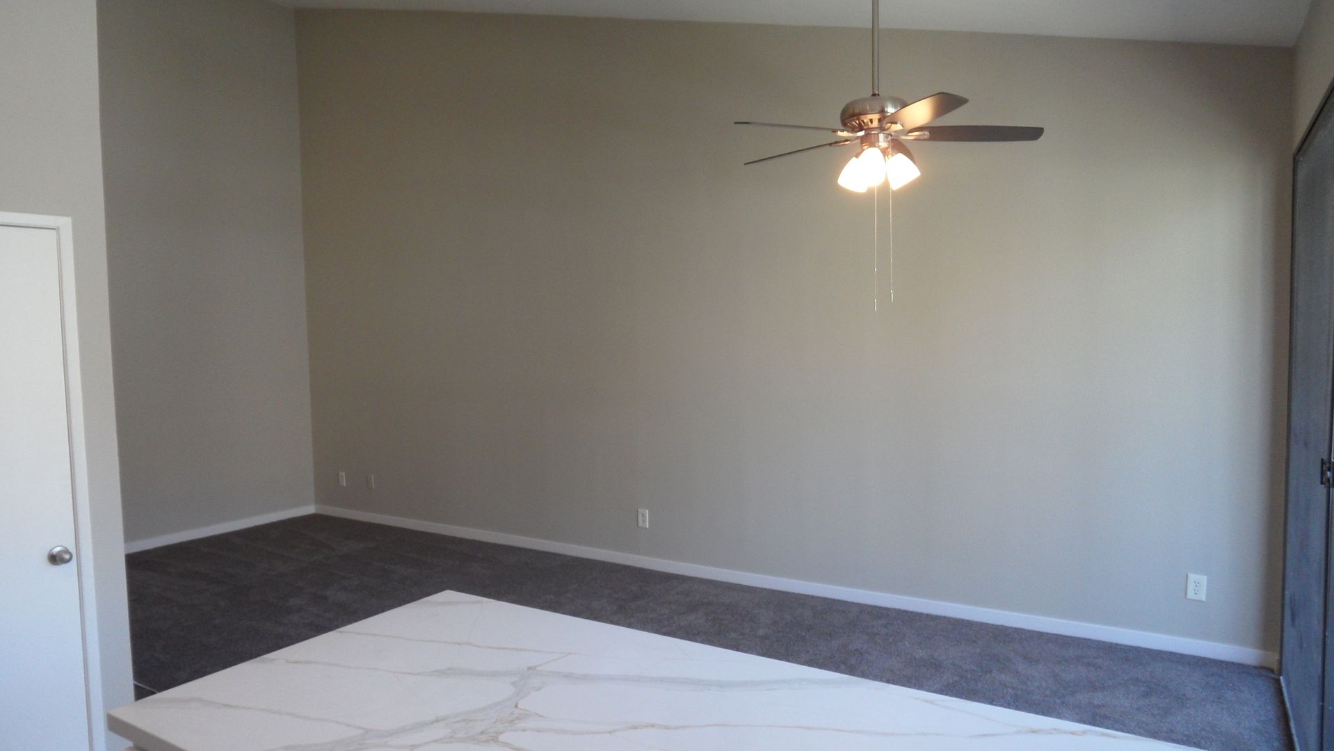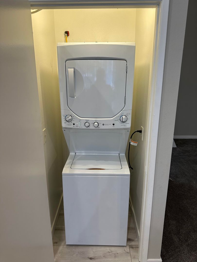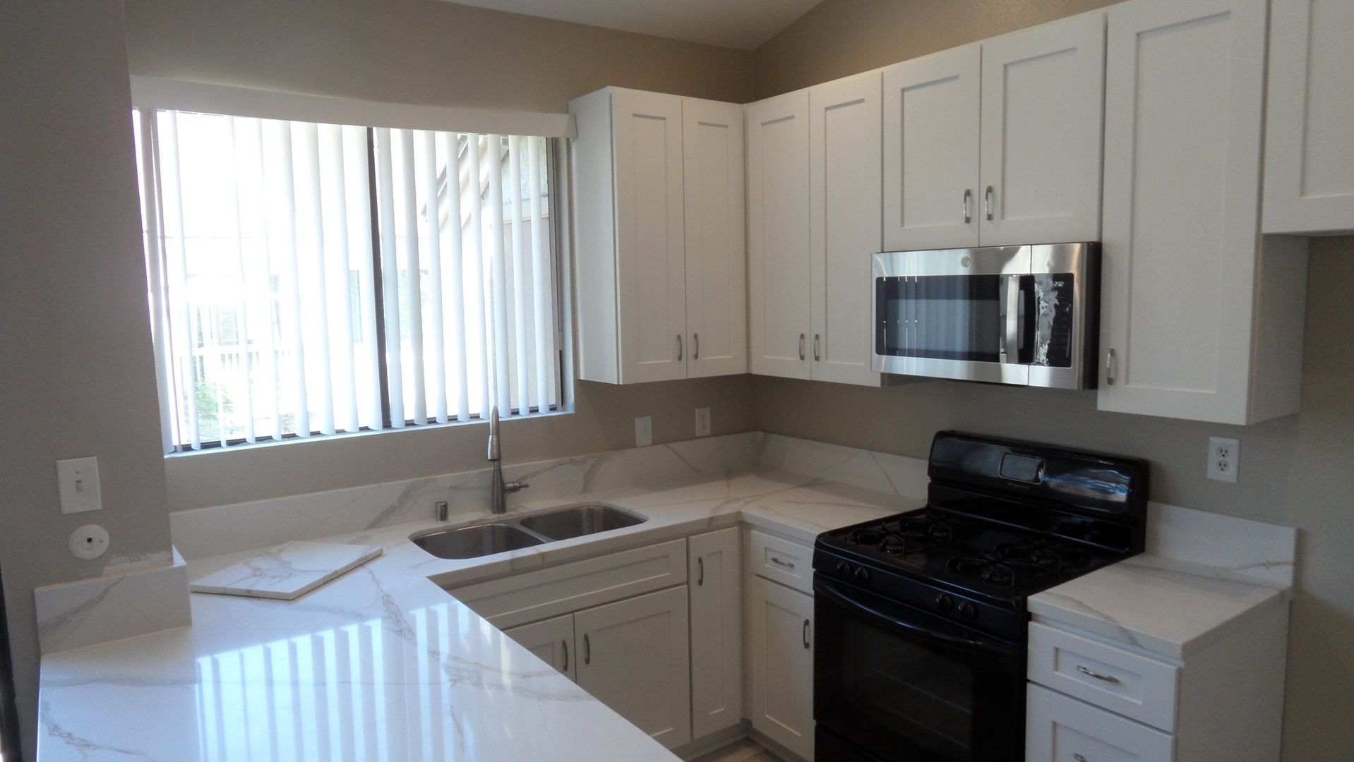 Remodeled upstairs Studio unit with sleeping loft, located on second level, in the desirable gated Lakeside community. Unit comes with 1 assigned carport. Unit features freshly painted two toned paint, new vinyl plank flooring, carpet and baseboards throughout, and central air conditioning. Remodeled kitchen with quartz countertops, breakfast bar, all new Shaker style soft-close cabinets and drawers, canned lighting, gas range, dishwasher, microwave. Large vaulted living area with ceiling fan and eating area just off the kitchen with oversized sliding glass door opens to balcony overlooking beautiful landscaping and creek. Balcony has storage closet. Upstairs loft with skylight and plenty of room for a queen-size mattress. Bathroom also has a brand new vanity and a shower/tub combo. Dual closets in dressing area. Stacked washer and dryer included and located inside the unit. Community boasts two pools and spas. Water and trash included in rent.